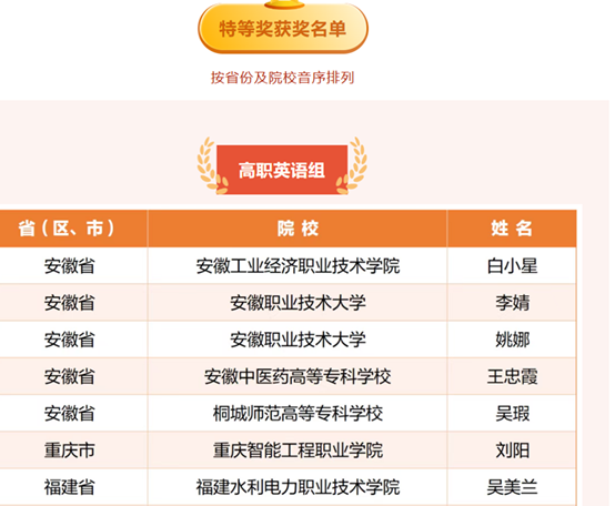 近日,外研社“教学之星”大赛——全国职业院校外语课程思政案例项赛结果正式揭晓,我院基础教学部王风丽老师凭借扎实的教学功底与创新的课程思政设计,从全国高职英语组赛道中脱颖而出,荣获特等奖。据悉,本年度大赛共设置高职英语组和中职英语组两大赛道,其中高职英语组赛道共评选出特等奖65名、一等奖153名、二等奖218名。